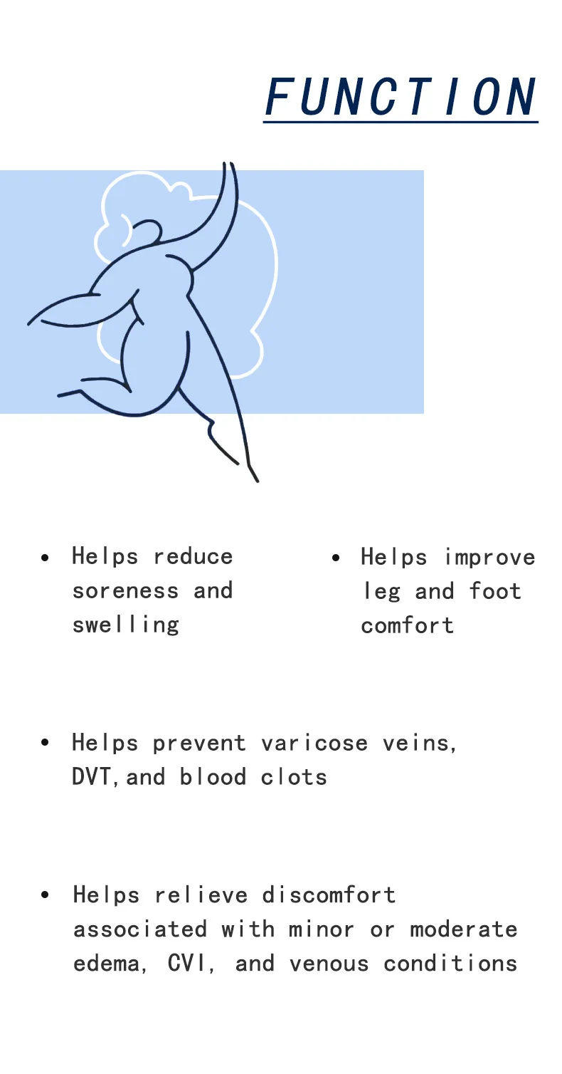 Level 2 (30-40mmHg): For those who have obvious symptoms in the lower limbs and are accompanied by leg discomfort (such as sore limbs, fatigue, swelling and eczema, cramps, tingling, pigmentation, etc.), phlebitis, pregnant, after saphenous vein excision, and deep vein thrombosis syndrome.