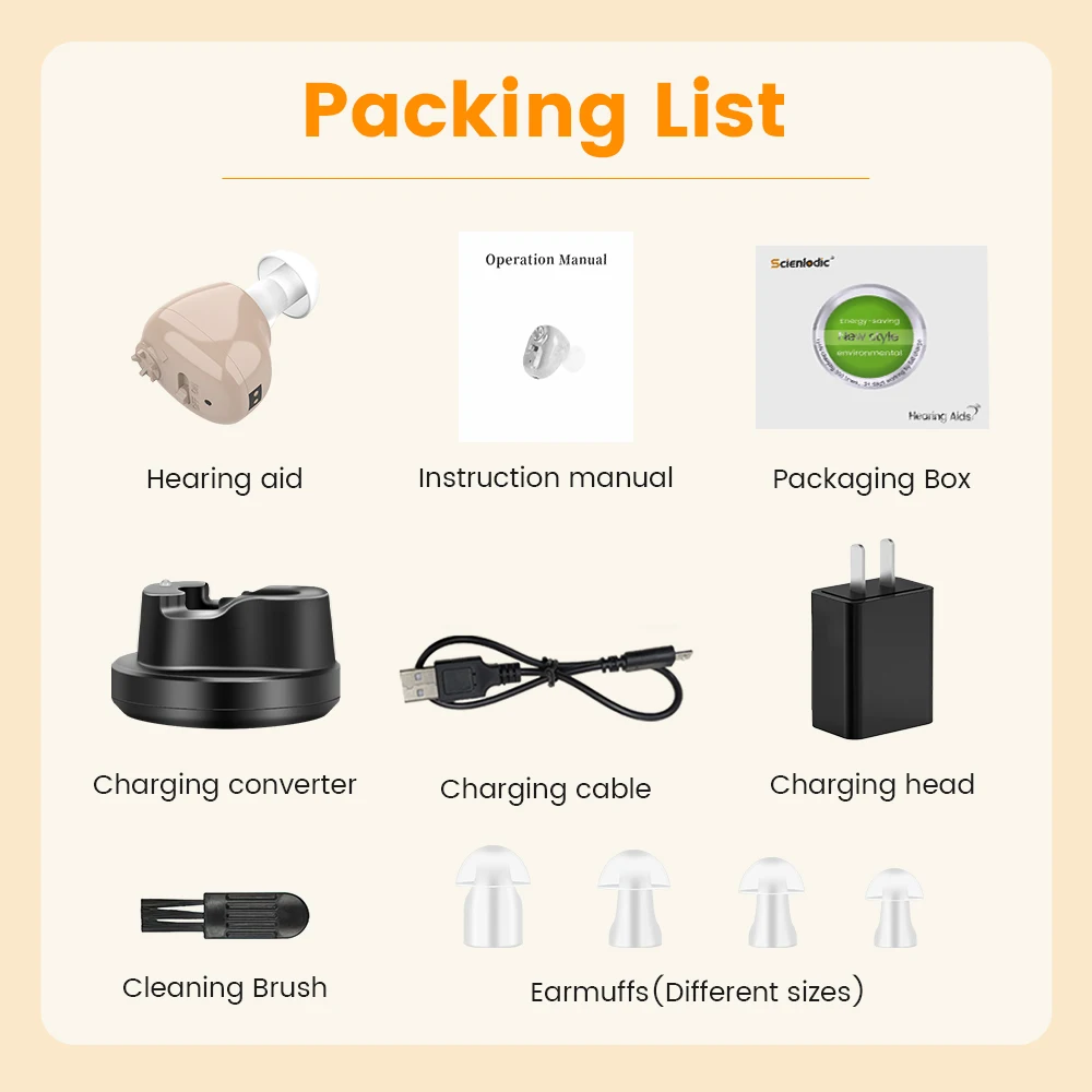 6. Gift bundled: We will give a hearing aid box to carry.Every set contains charger, earbuds and cleaning brush etc.Will be great gifts for your friends or families.