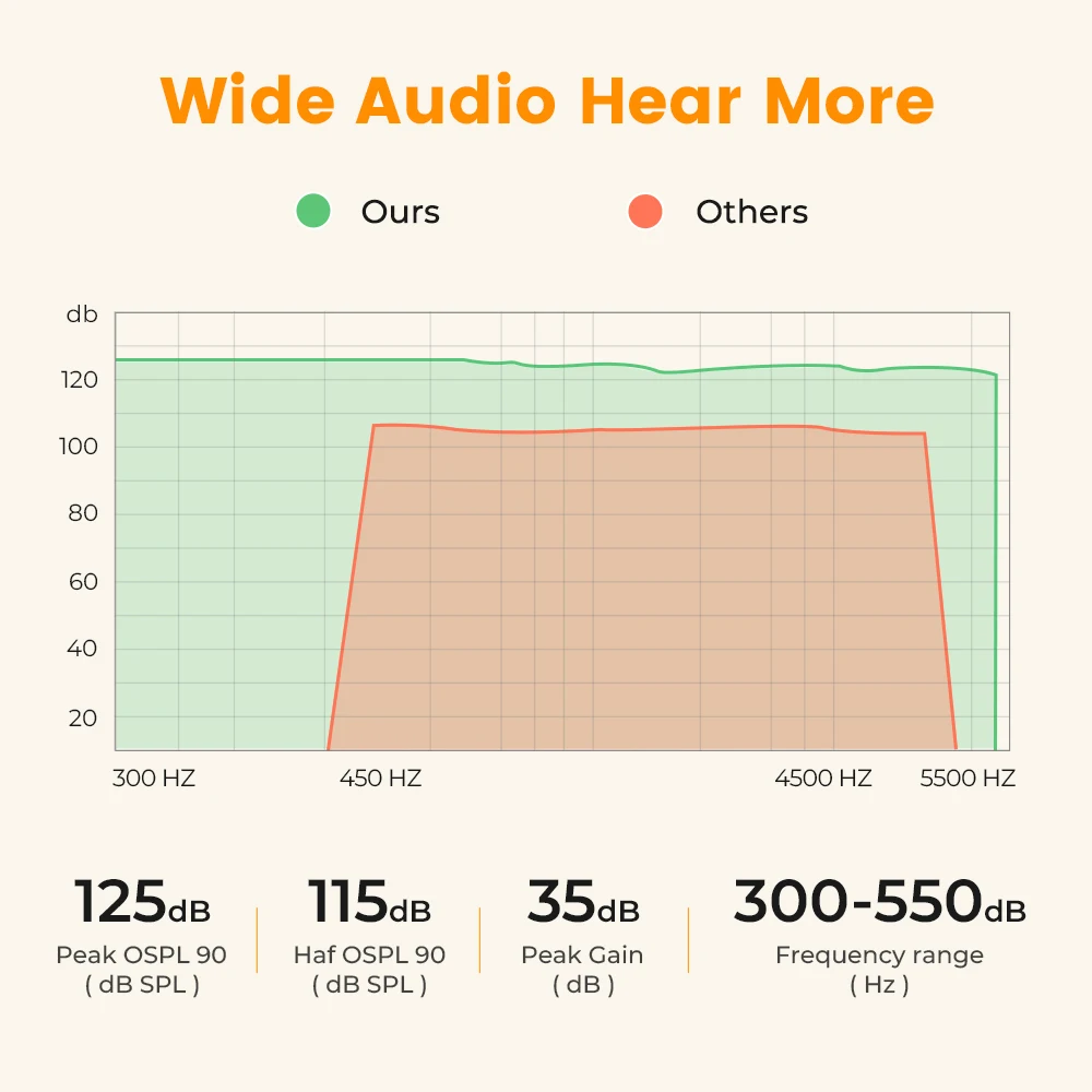 1. Peak Gain(dB): 35dB,Suitable for mild to moderate hearing loss (Reference hearing loss map).